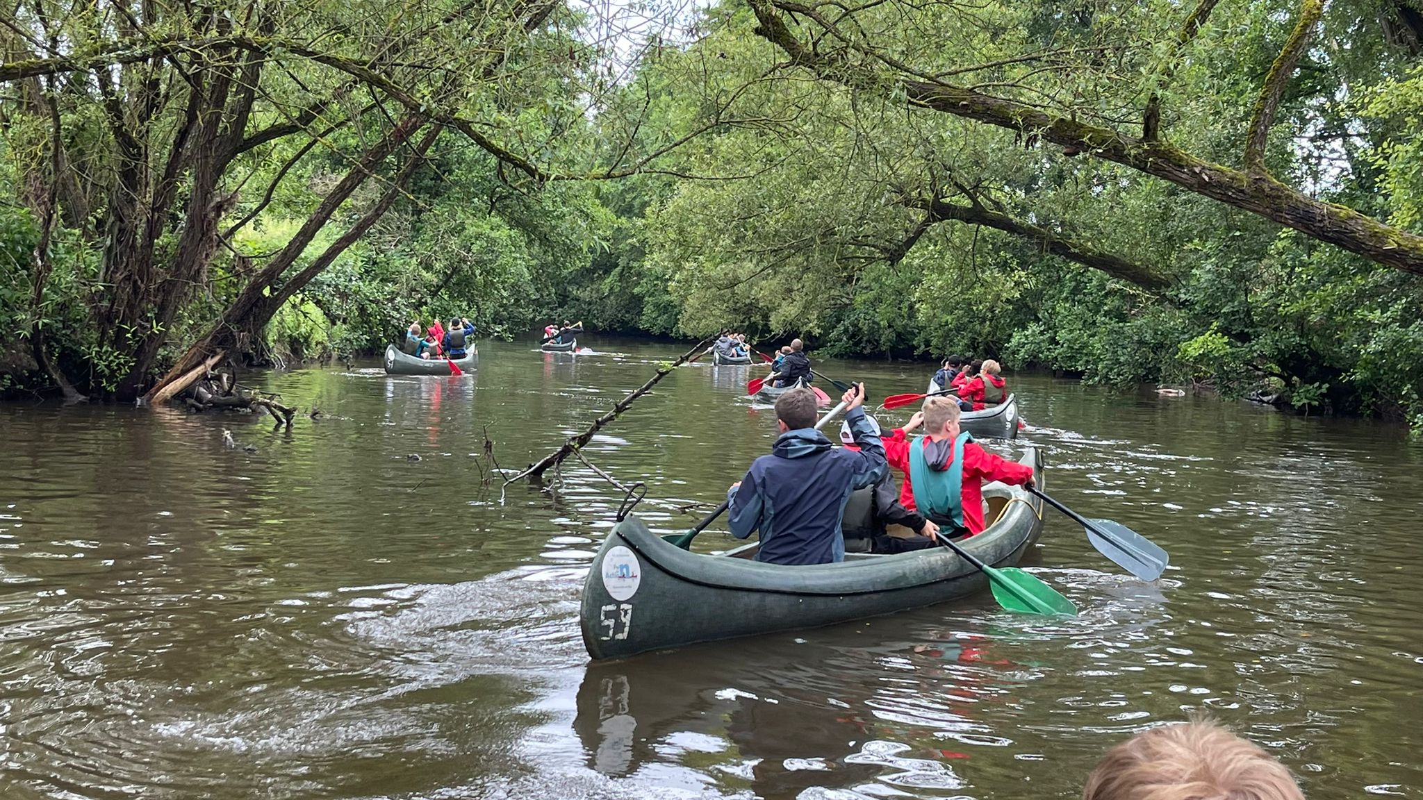 Kurze Begrüßung, danach direkt das Wesentliche, auf das sich alle schon freuten. Als erstes wurden den Jungs die Schwimmwesten angelegt, danach gab es die Einweisung ins Kanufahren. Die Aufregung stieg von Minute zu Minute. Endlich durften die Jungs in die Boote und wurden auf dem Wasser ausgesetzt.